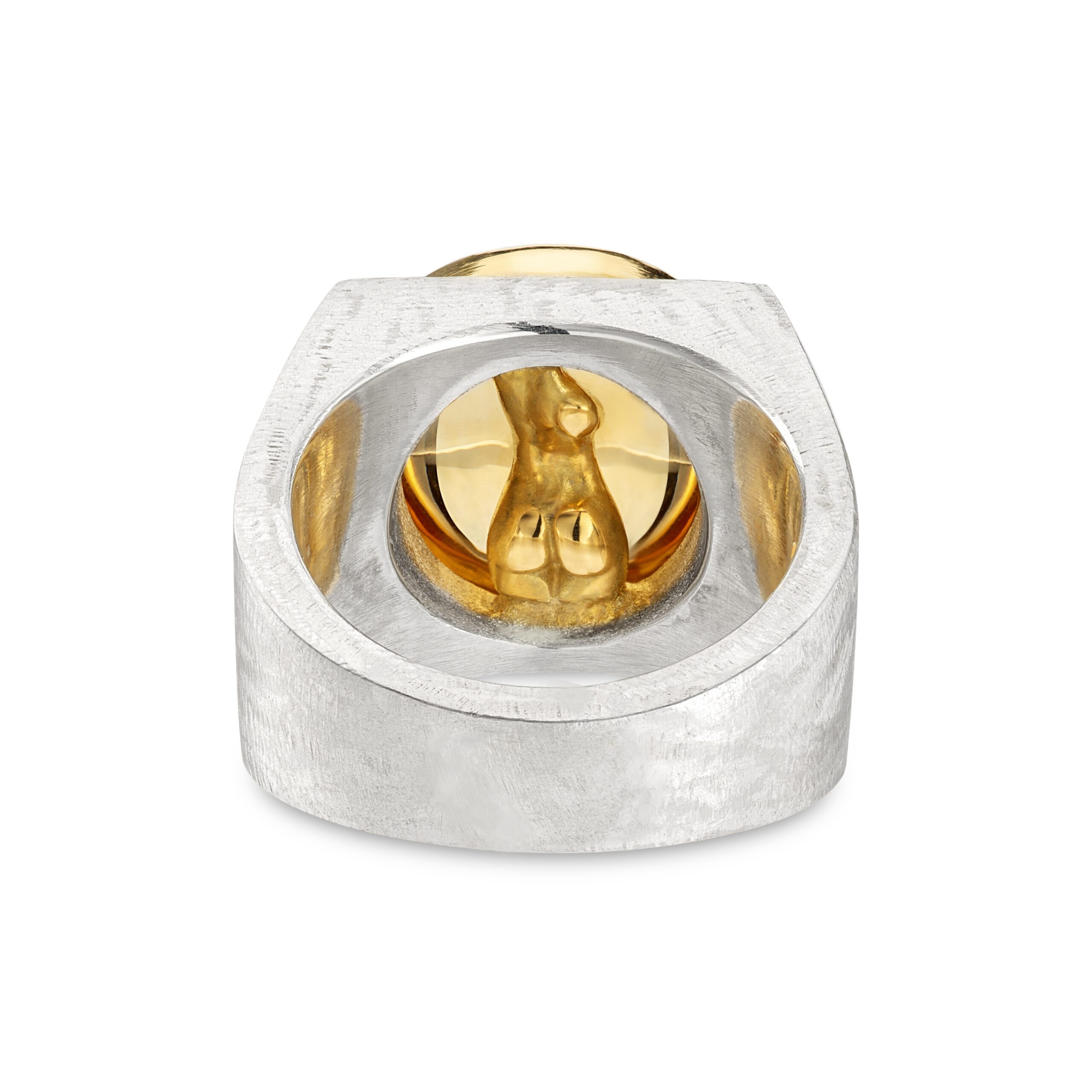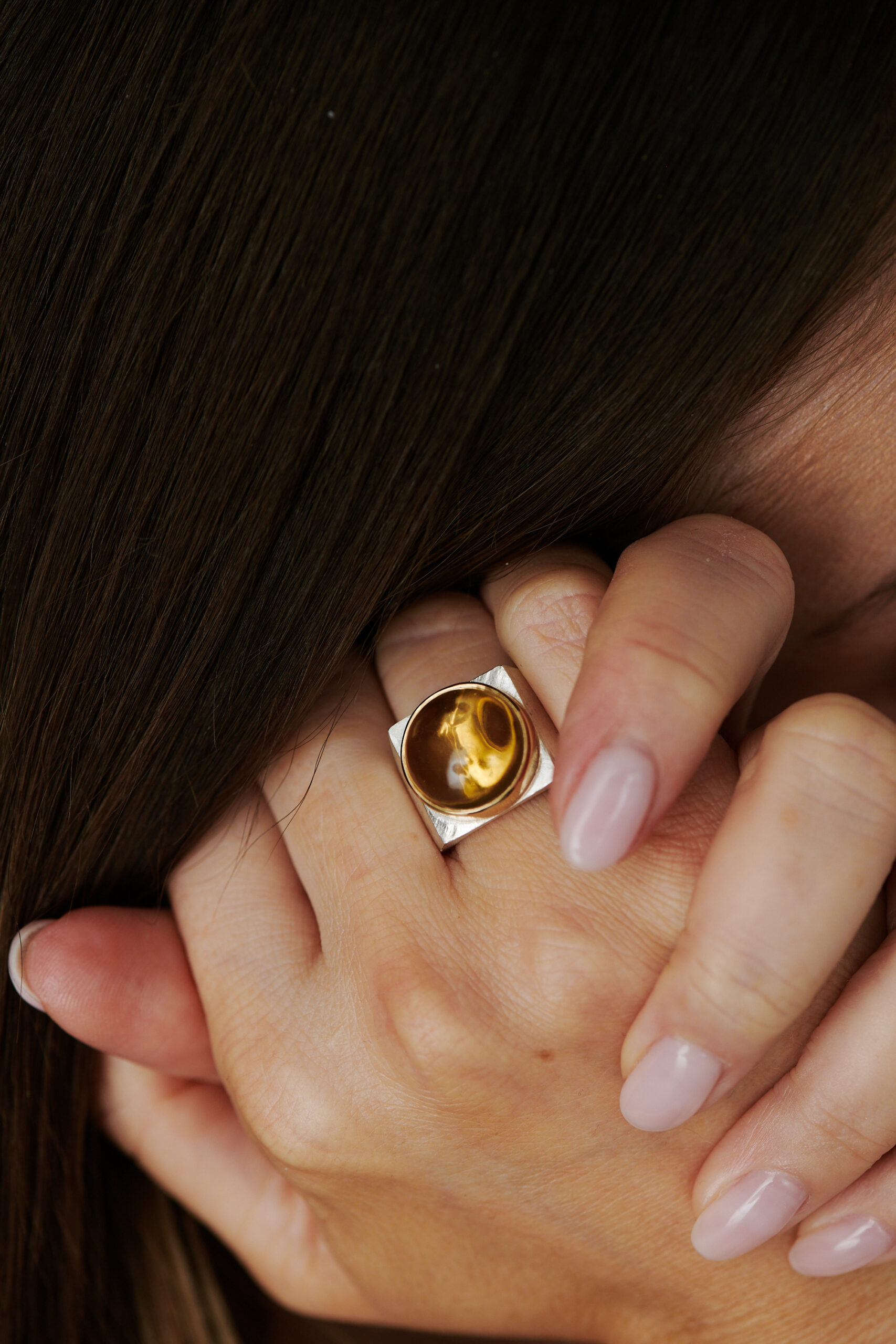 Set with a high-domed cabochon golden citrine, the ring distorts and magnifies the 18ct gold figure beneath. Sometimes crisp, sometimes blurred, she dances in and out of clarity.