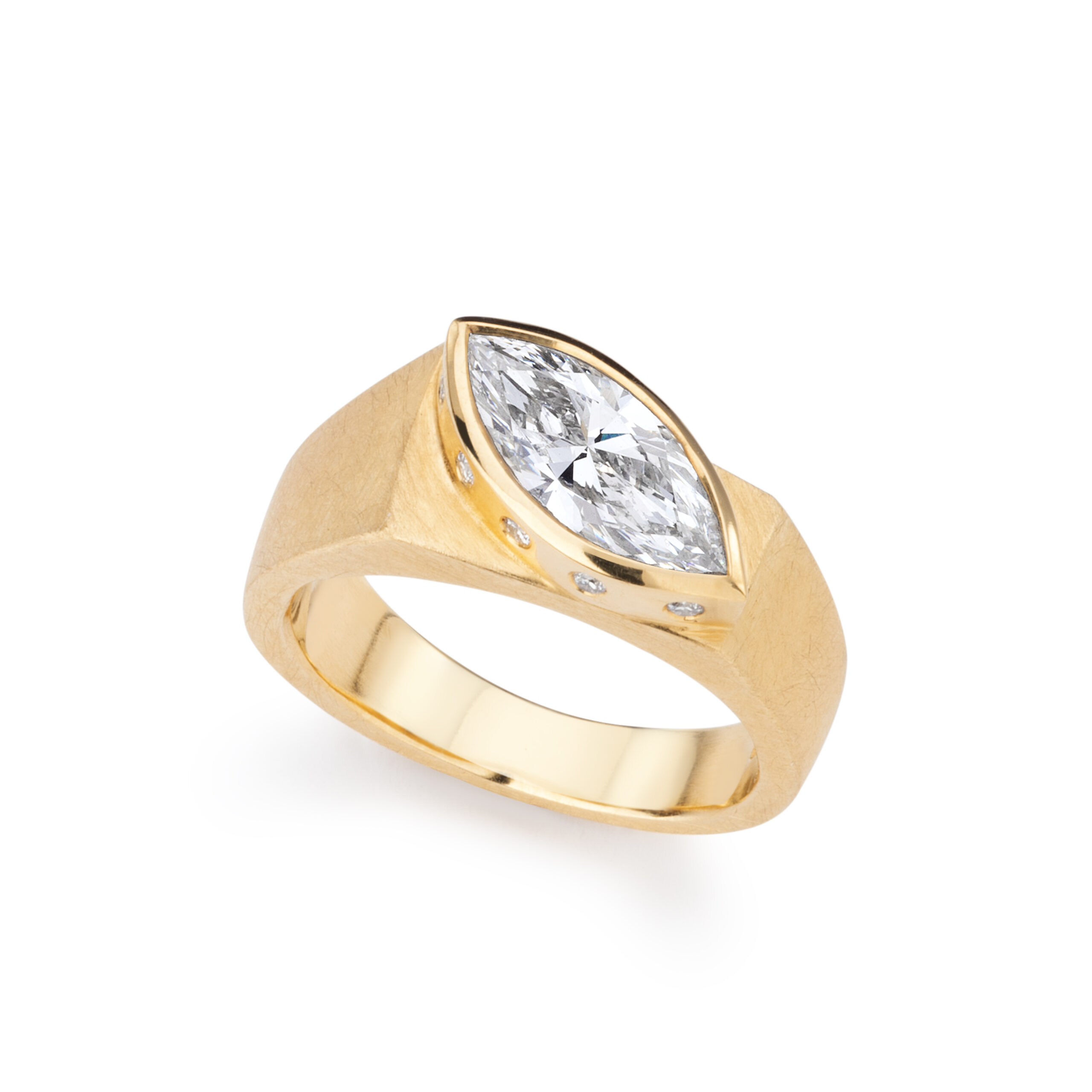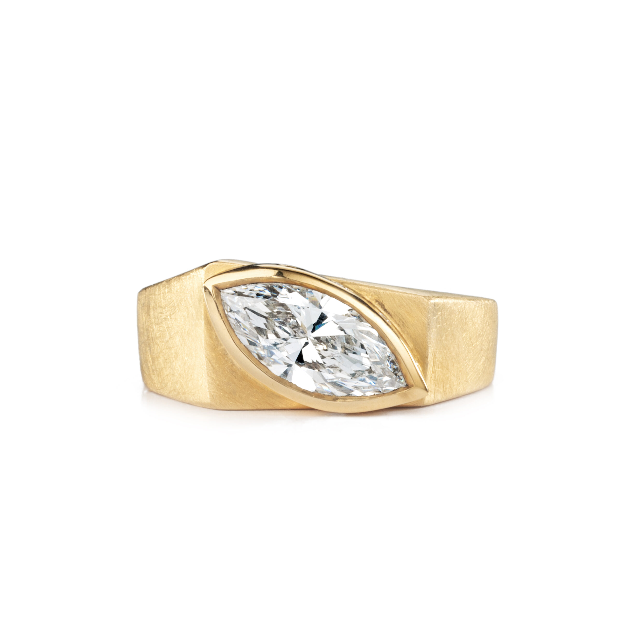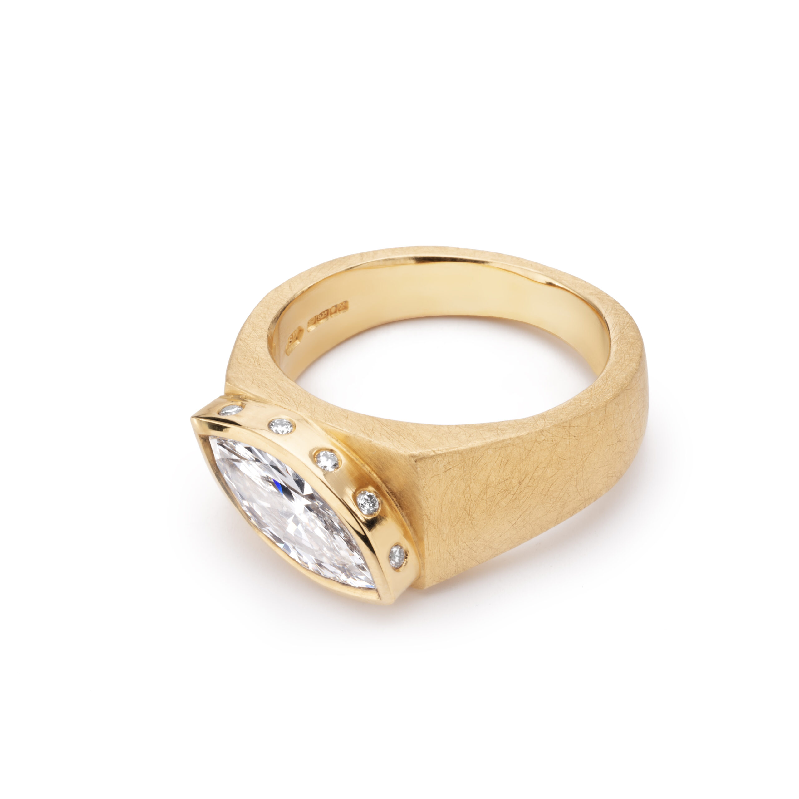 This 18ct gold signet ring features a 1.49ct lab grown marquise-cut diamond as its centrepiece.