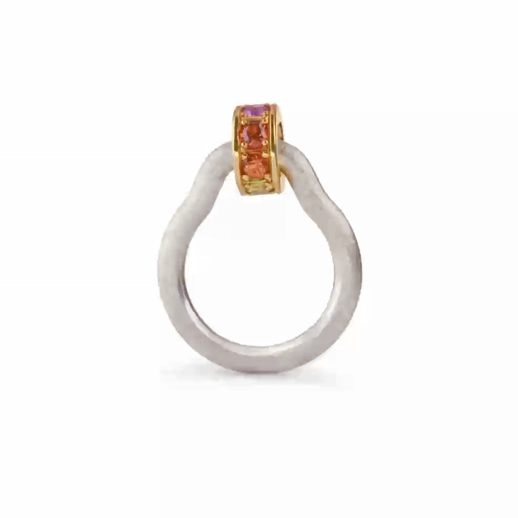 This kinetic ring features a smooth, rounded silver shank with a rotating 18ct yellow gold bead, grain-set with a spectrum of sapphires in vivid rainbow hues.