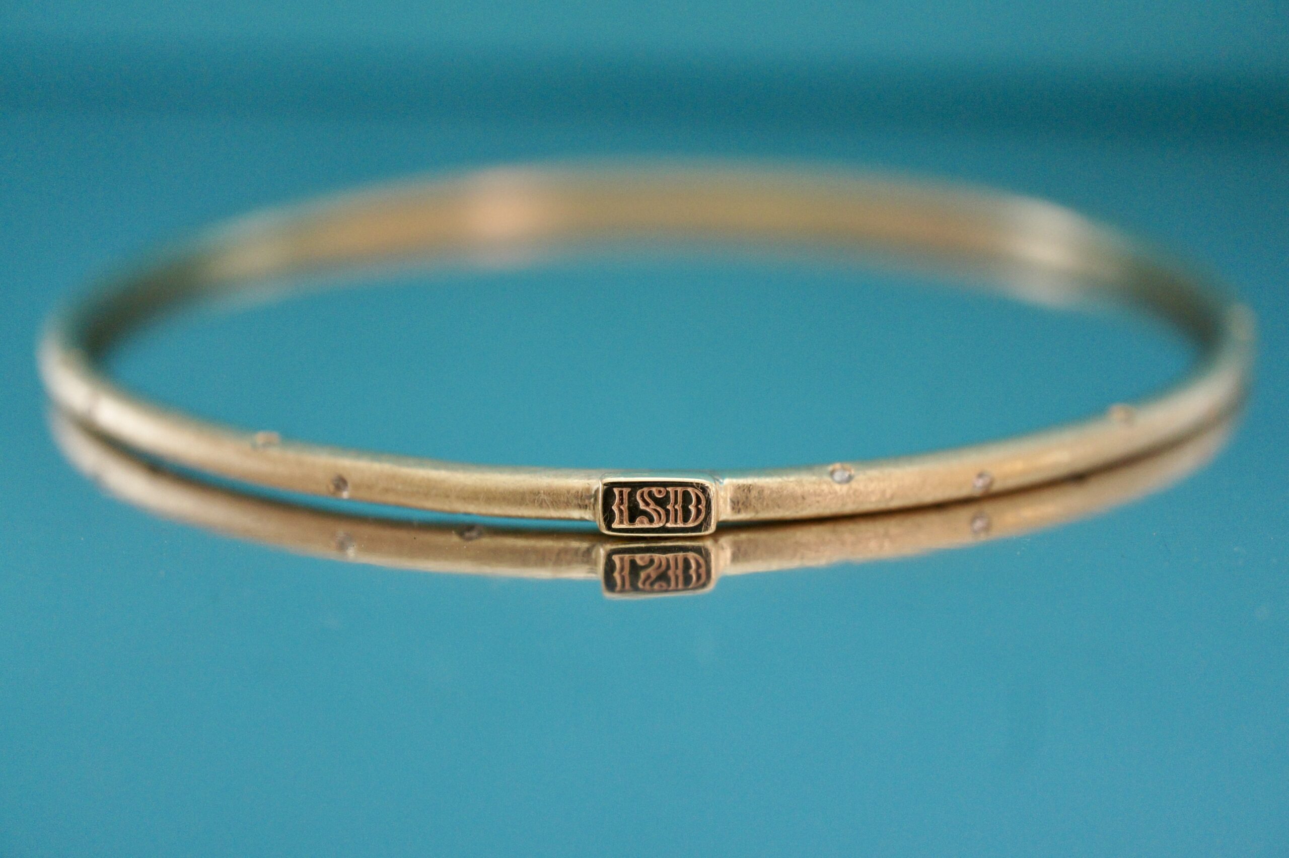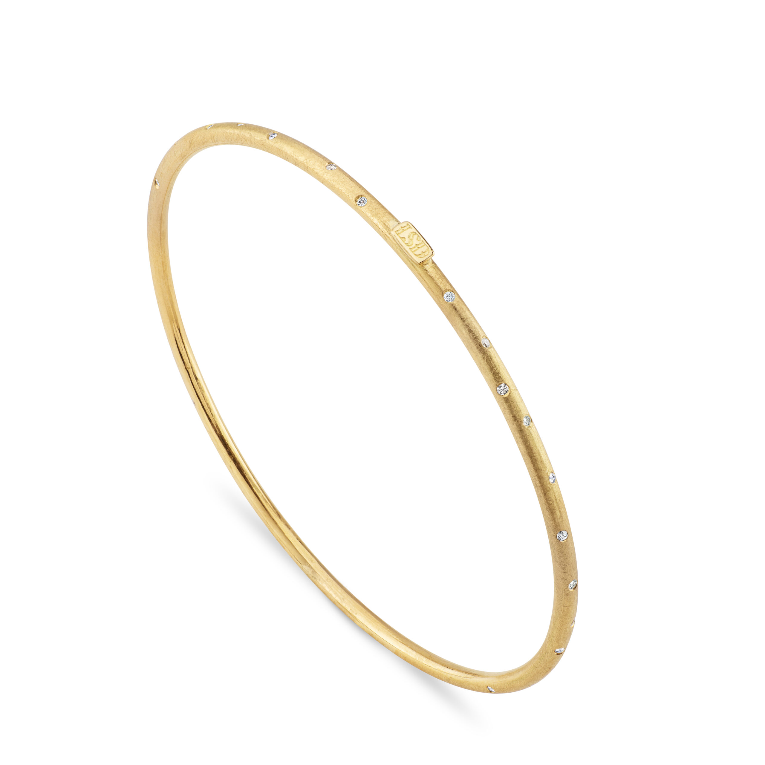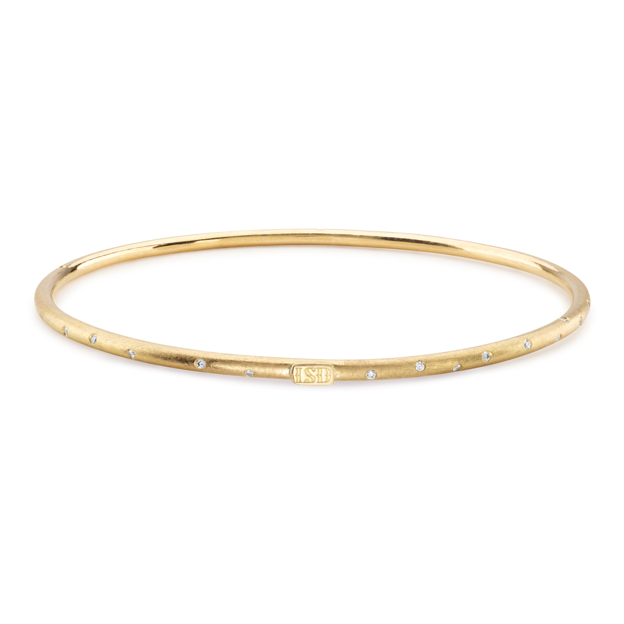An oval bangle with a matte finish, set with 30 scattered diamonds and stamped with our signature LSD tag. Available in 9ct and 18ct yellow gold.