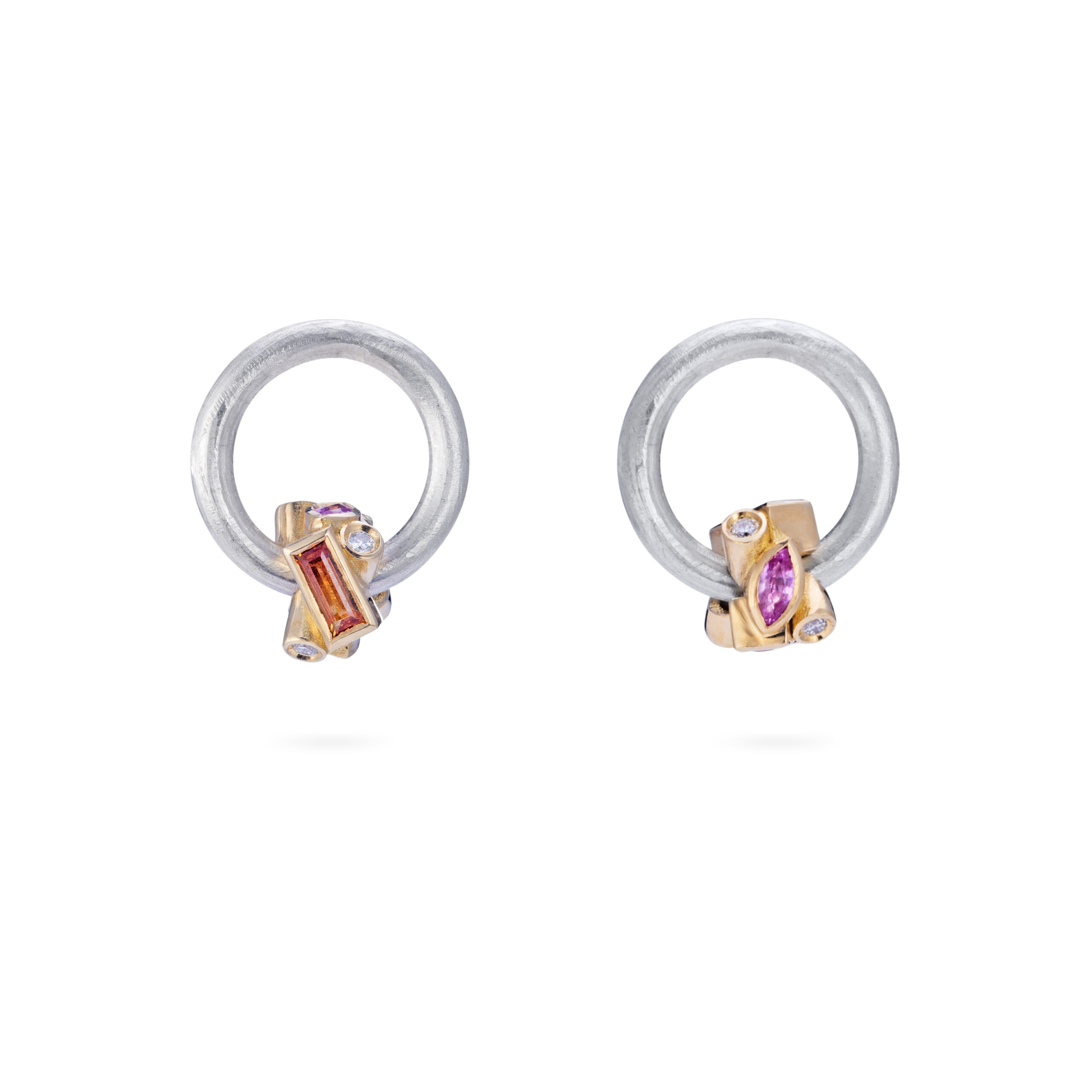 The silver circle holds an 18ct yellow gold bead that spins in orbit, set with fiery orange and blush-pink sapphires, finished with sparkling diamonds.